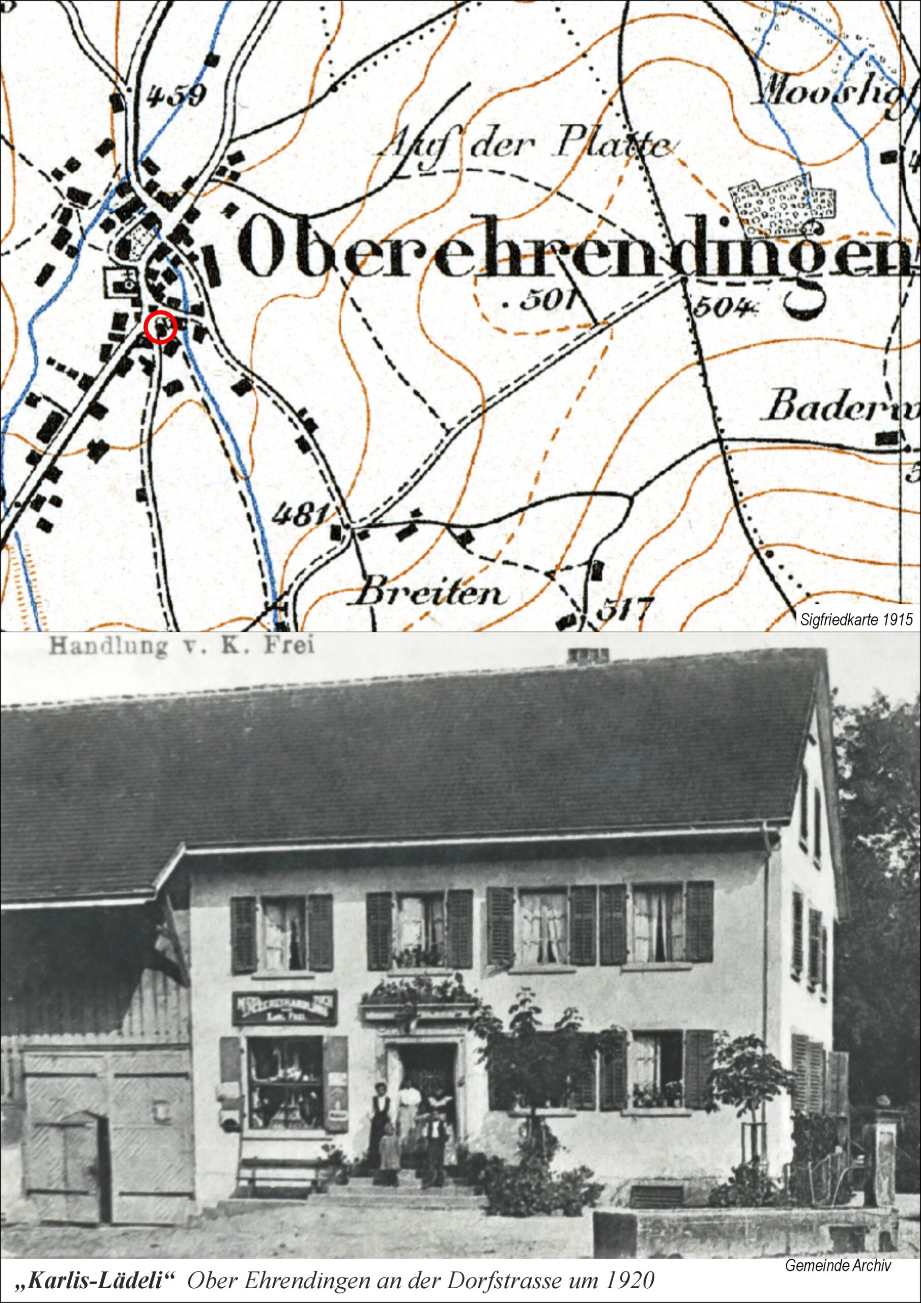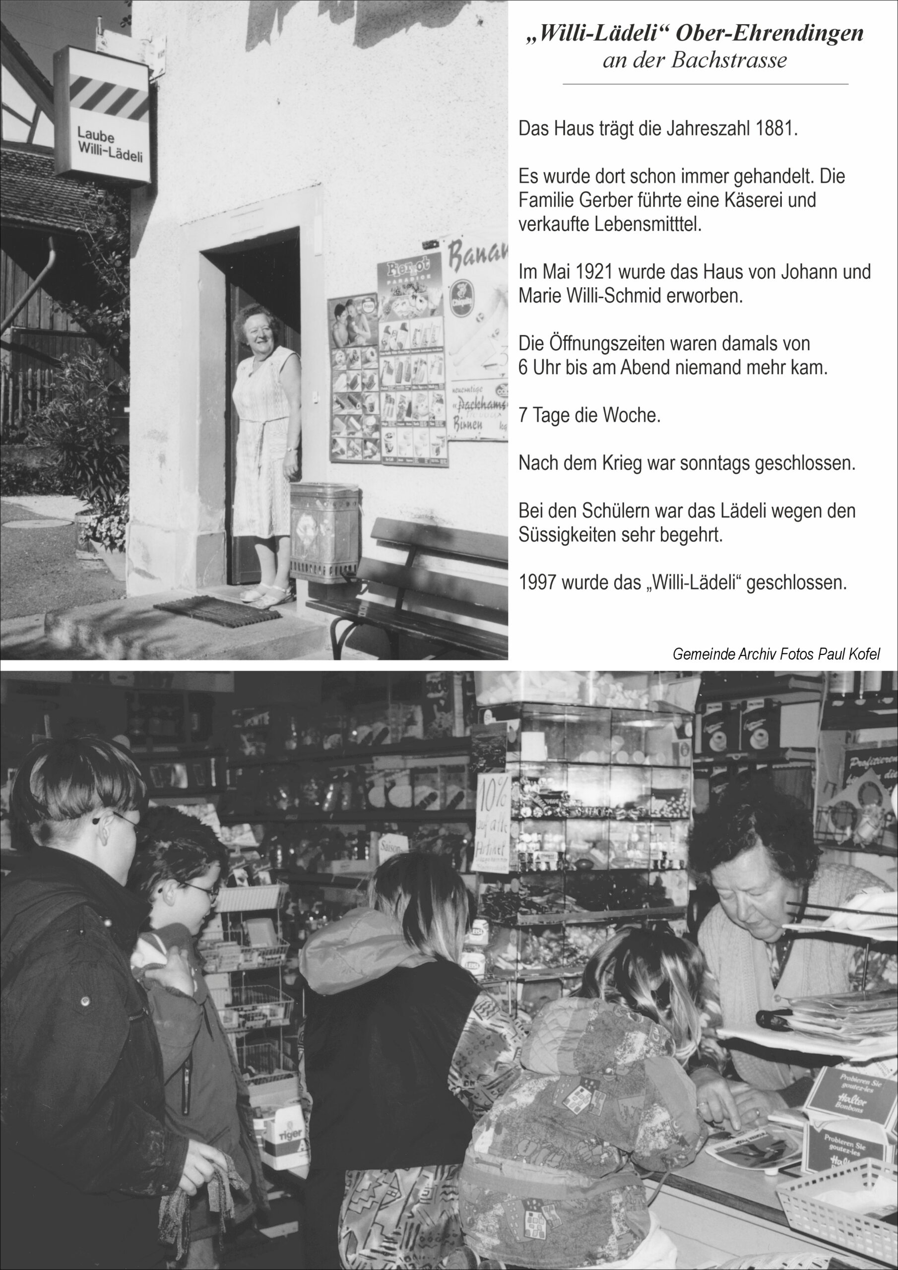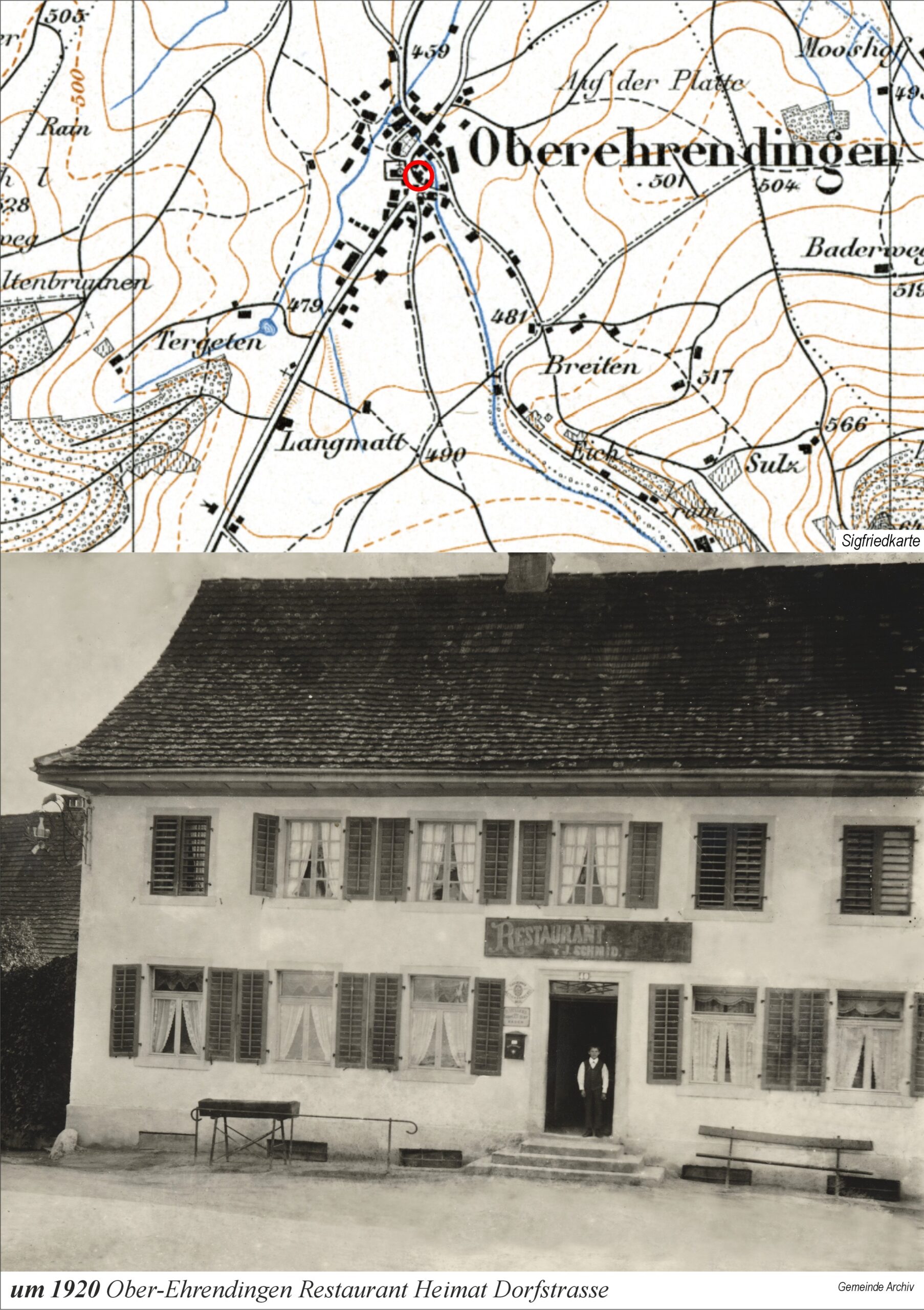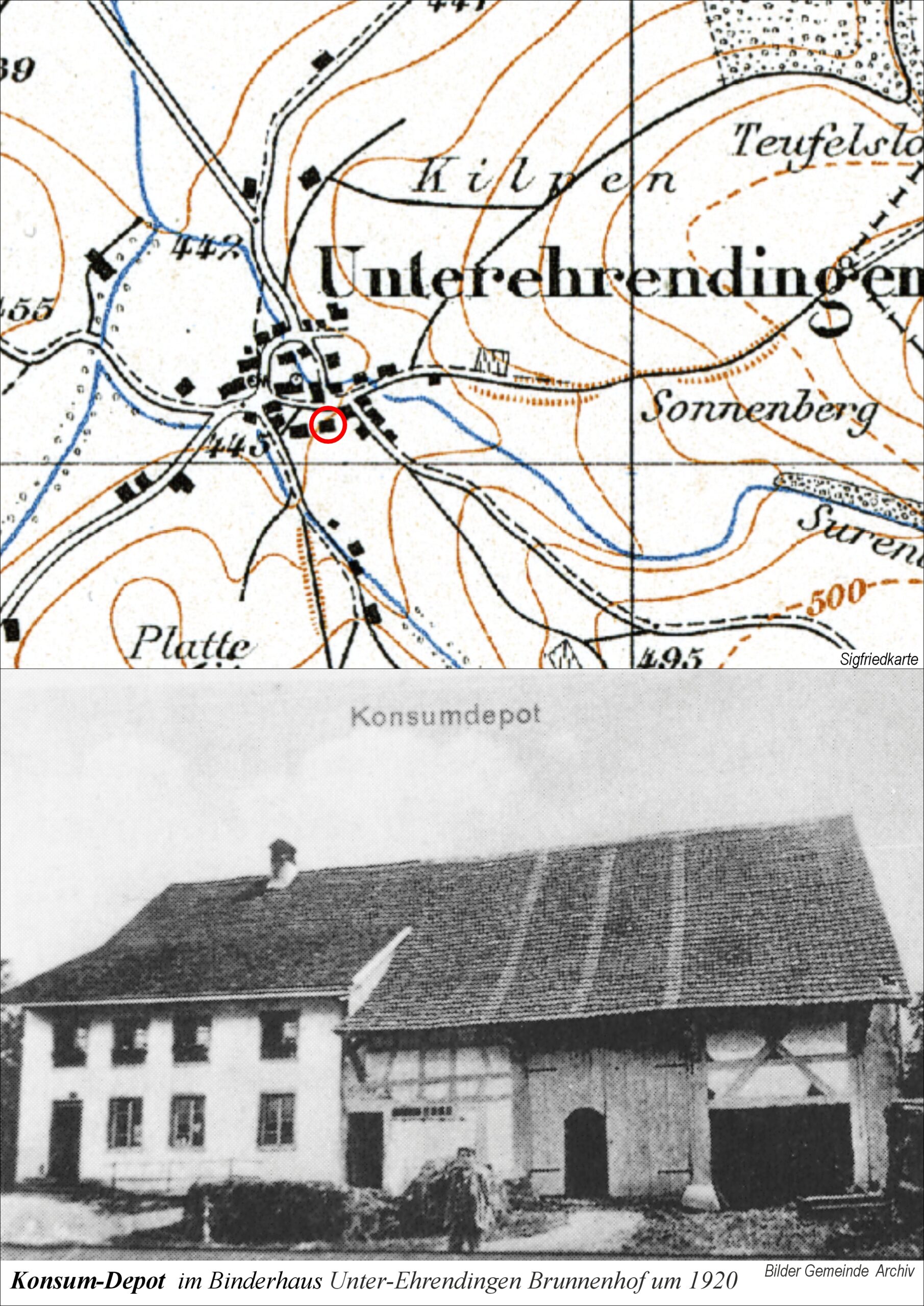 Das Gewerbe in Ehrendingen hat sich stark gewandelt. Verschwunden sind zum Beispiel die Ziegelbrennerei [1], die drei Gipsmühlen [3] [4] [5], die Sattlerei, die Wagnerei, die Dorfschmiede, die Sägerei [6] und die grosse Zementfabrik [2]. Dafür ist vieles Neues erstanden. Ebenso gab es Änderungen bei den Handelsgeschäften. Wir hatten mal eine Milchhütte [7], ein Salzhüsli [8], „Karlis Lädeli“, den „Willi Lädeli“, ein Konsumgeschäft im Oberdorf und ein Konsumdepot im Unterdorf [9]. Auf einigen Fotos der Ausstellung können wir alteingesessene Geschäfte wiedererkennen, die es heute noch gibt, zum Beispiel der Darlehenskassenverein (heute Raiffeisenbank), die AVIA-Tankstelle und die Metzgerei im Oberdorf. Die älteren Ehrendinger mögen sich noch daran erinnern, wieviele Wirtschaften wir einmal hatten. Zwar gibt es Frohsinn, Eintracht, Hirschen und Höhtal nicht mehr, aber das kulinarische Angebot von Ehrendingen ist trotzdem auch heute noch sehr gut.