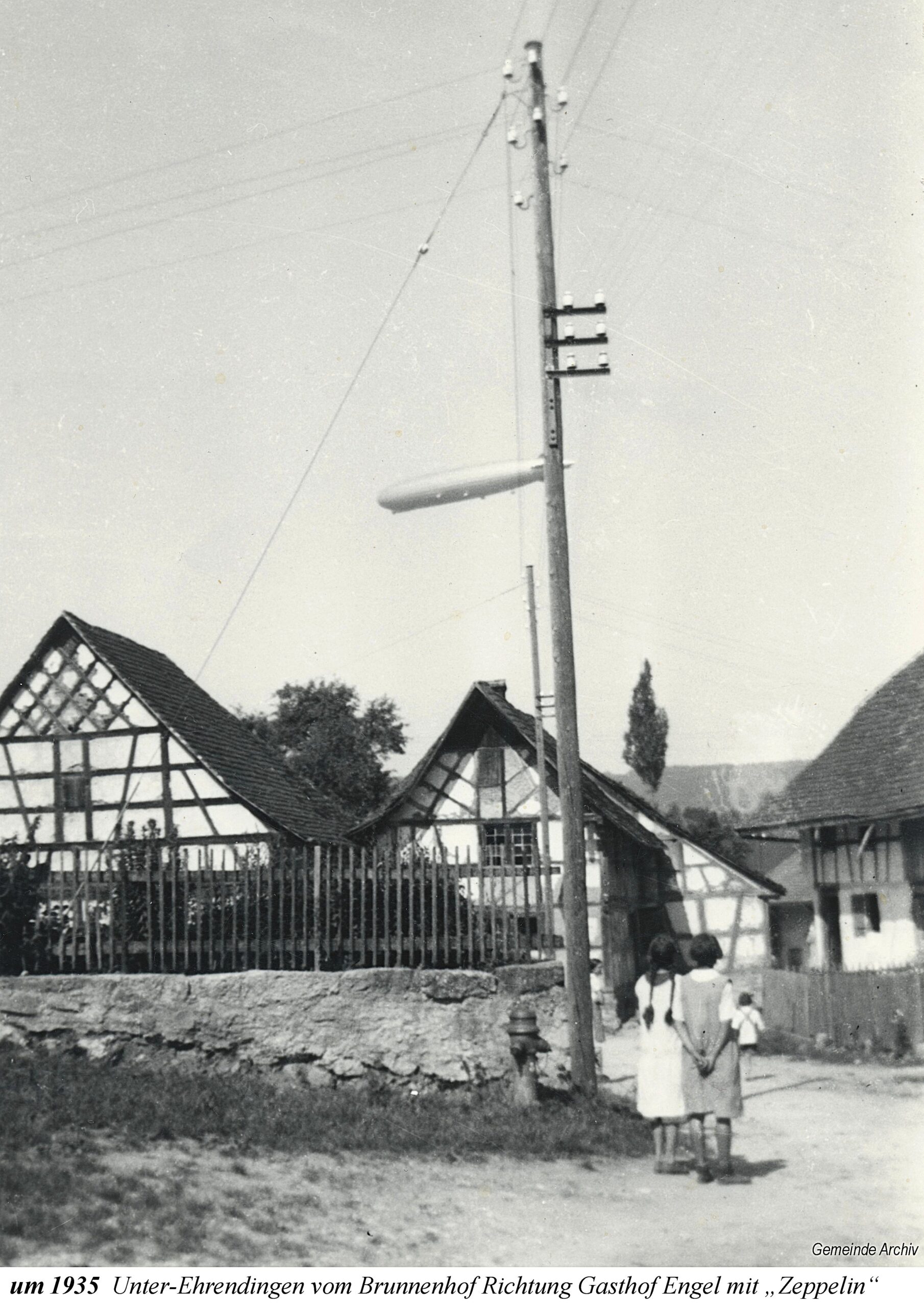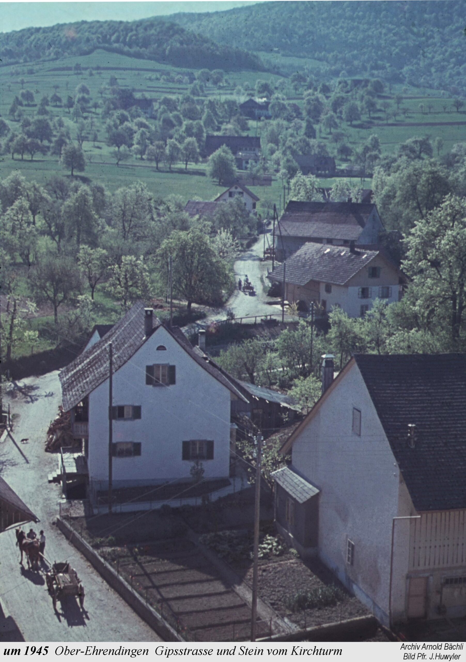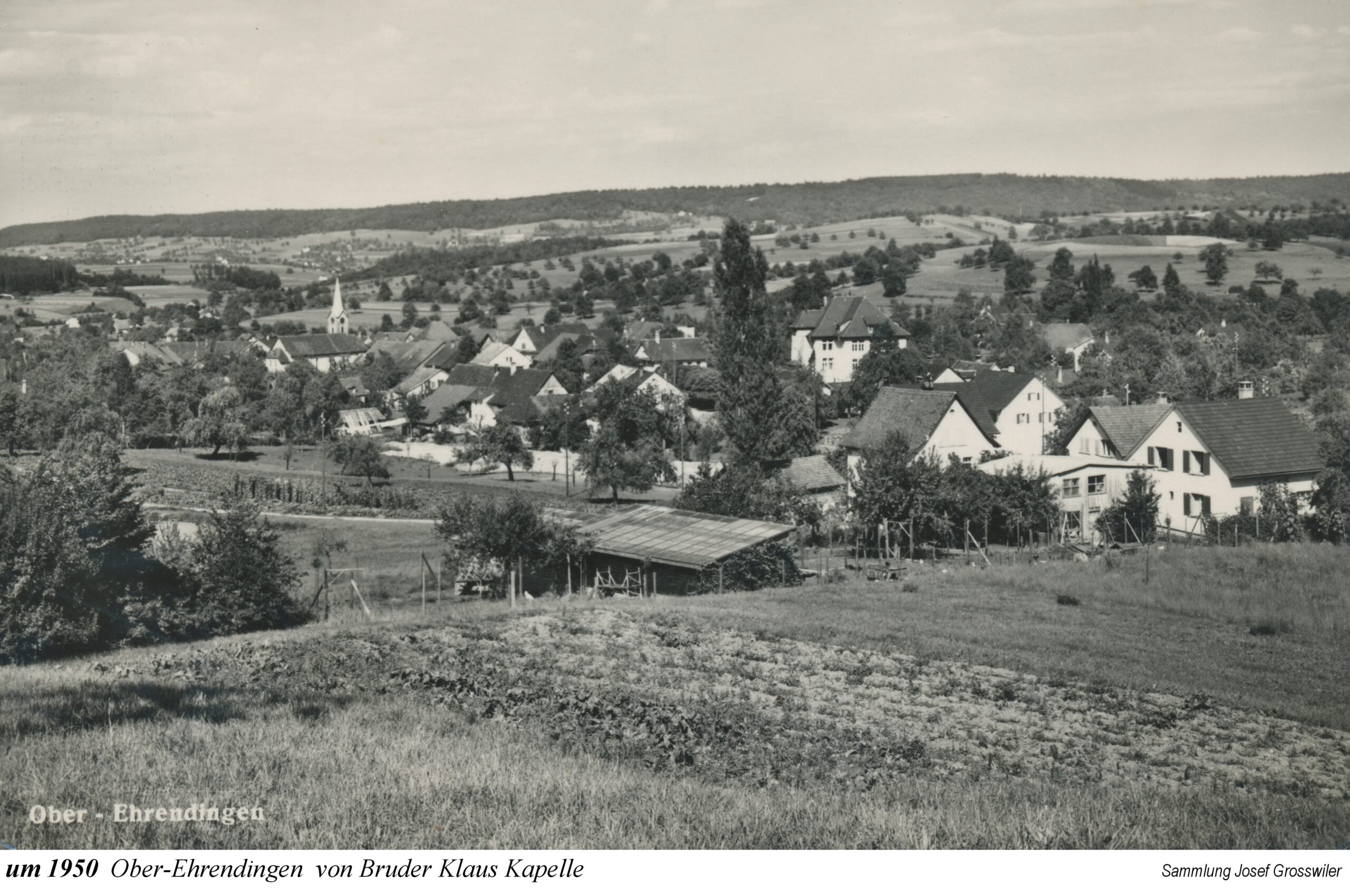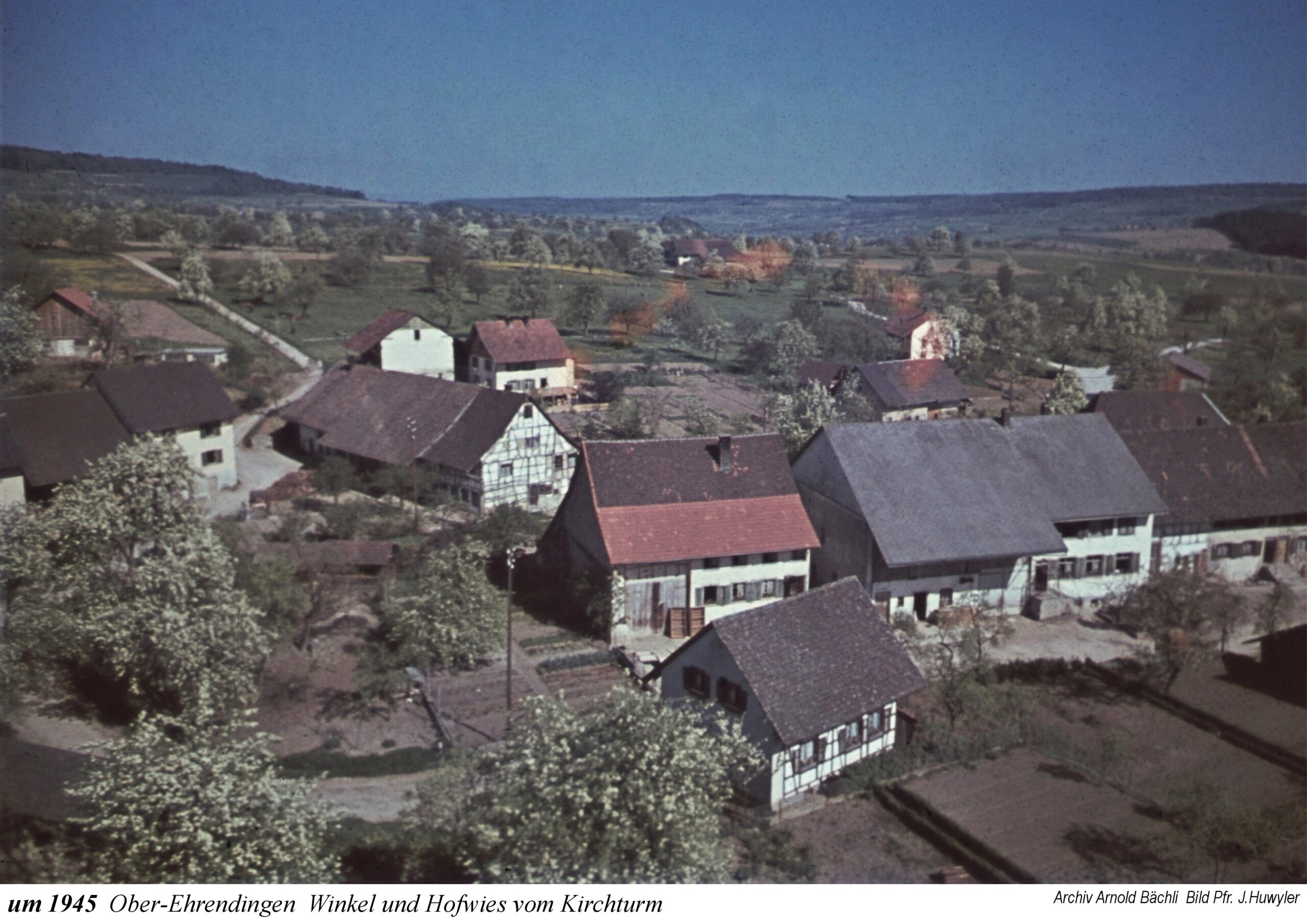 Die Ausstellung beginnt mit einem Ausschnitt aus der Zürcher-Cantons-Karte aus dem Jahr 1667. In Oberehrendingen sind neben der Kirche 12 Häuser zu sehen, in Unterehrendingen 15 Häuser sowie 3 Häuser in der Tiefenwaag. Es folgen Ansichten auf Postkarten, die Grüsse aus Ehrendingen in die weite Welt verschickt haben mögen. Eine Zeichnung vom Oberdorf aus dem Jahr 1836 zeigt die Pfarrkirche St. Blasius noch mit dem alten Käsbissenturm. Dann sehen wir Fotografien ab etwa dem Jahr 1910. Im Jahr 1935 bestaunen die Kinder einen grossen Zeppelin, der über Ehrendingen hinwegschwebt. Bemerkenswerterweise sind die Fotos aus dem Jahr 1945, die Pfarrer Huwyler teilweise vom Kirchturm herab geschossen hat, bereits in Farbe aufgenommen.
