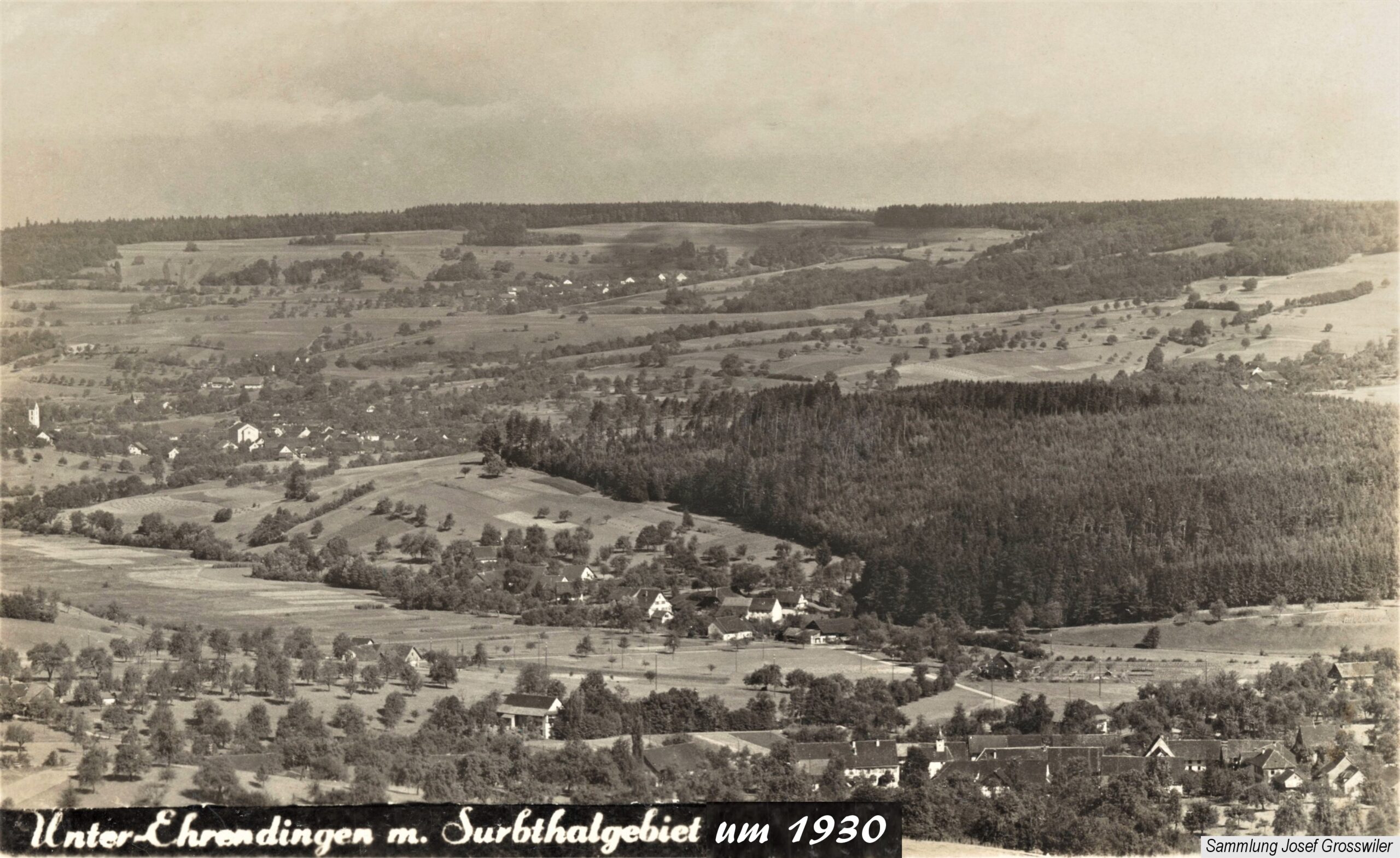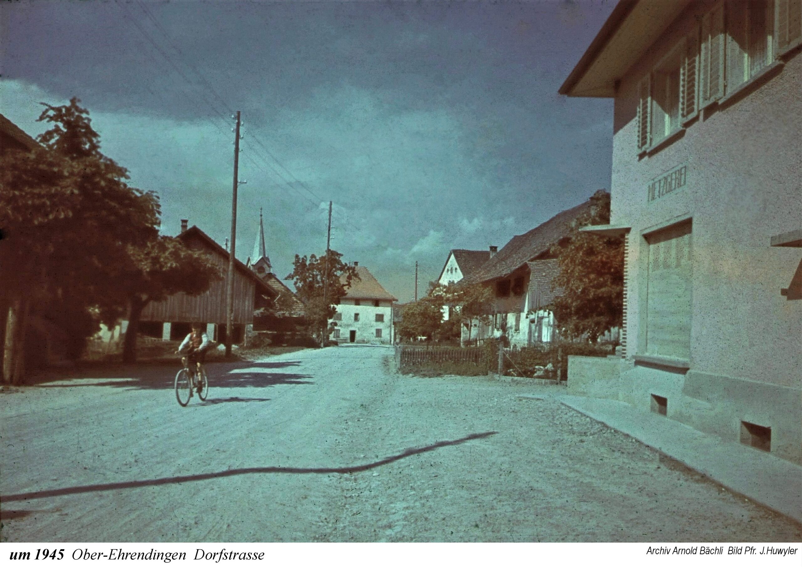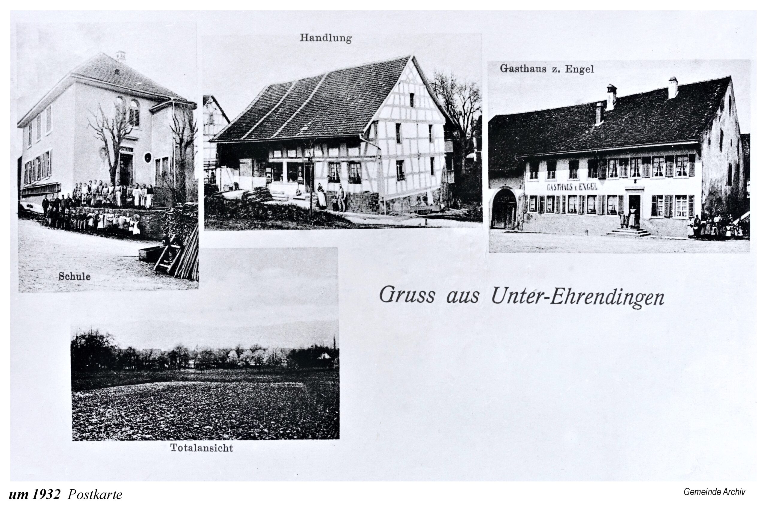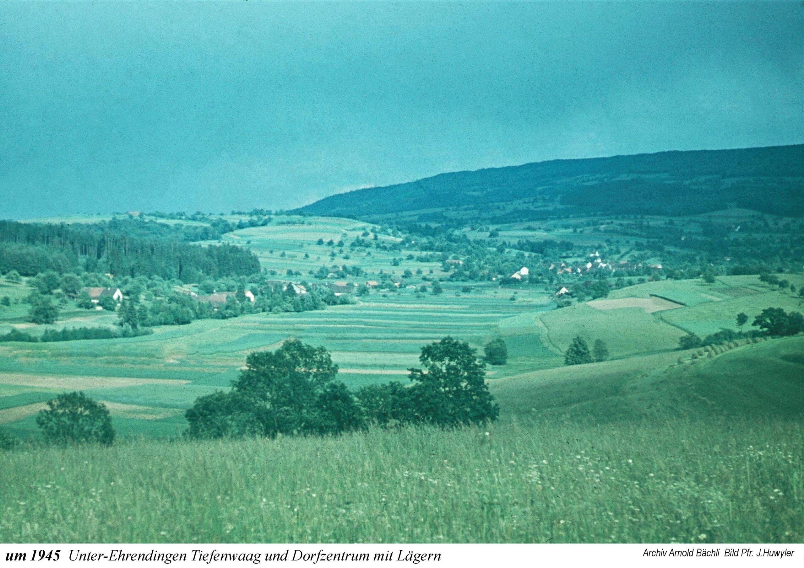 Die Ausstellung beginnt mit einem Ausschnitt aus der Zürcher-Cantons-Karte aus dem Jahr 1667. In Oberehrendingen sind neben der Kirche 12 Häuser zu sehen, in Unterehrendingen 15 Häuser sowie 3 Häuser in der Tiefenwaag. Es folgen Ansichten auf Postkarten, die Grüsse aus Ehrendingen in die weite Welt verschickt haben mögen. Eine Zeichnung vom Oberdorf aus dem Jahr 1836 zeigt die Pfarrkirche St. Blasius noch mit dem alten Käsbissenturm. Dann sehen wir Fotografien ab etwa dem Jahr 1910. Im Jahr 1935 bestaunen die Kinder einen grossen Zeppelin, der über Ehrendingen hinwegschwebt. Bemerkenswerterweise sind die Fotos aus dem Jahr 1945, die Pfarrer Huwyler teilweise vom Kirchturm herab geschossen hat, bereits in Farbe aufgenommen.