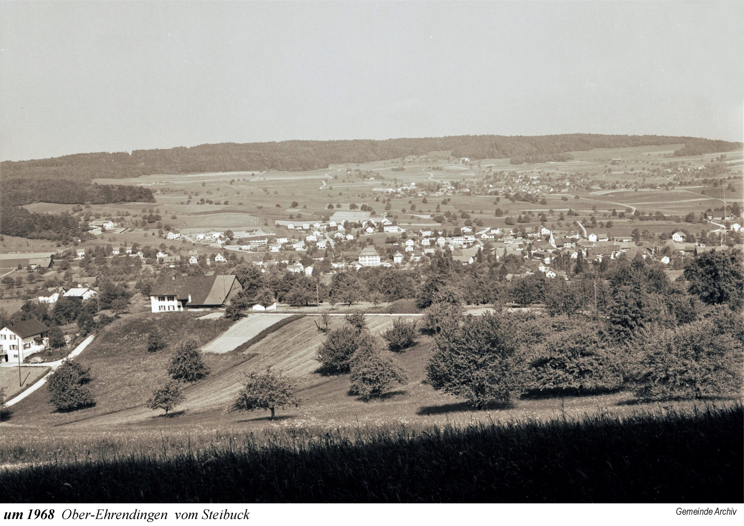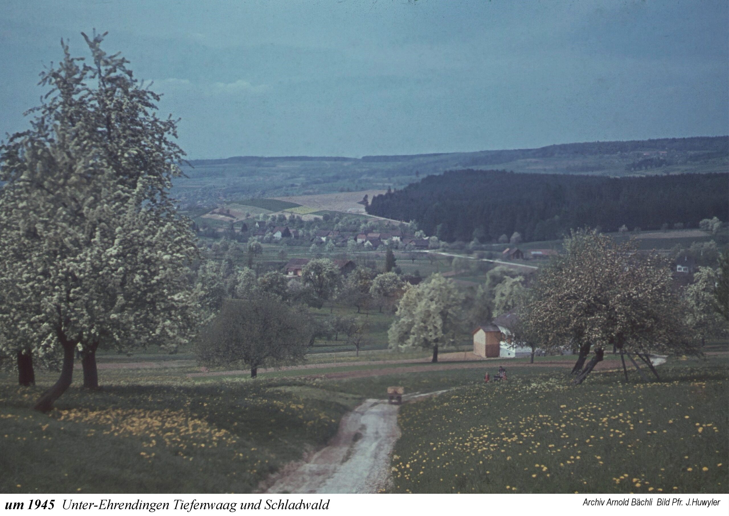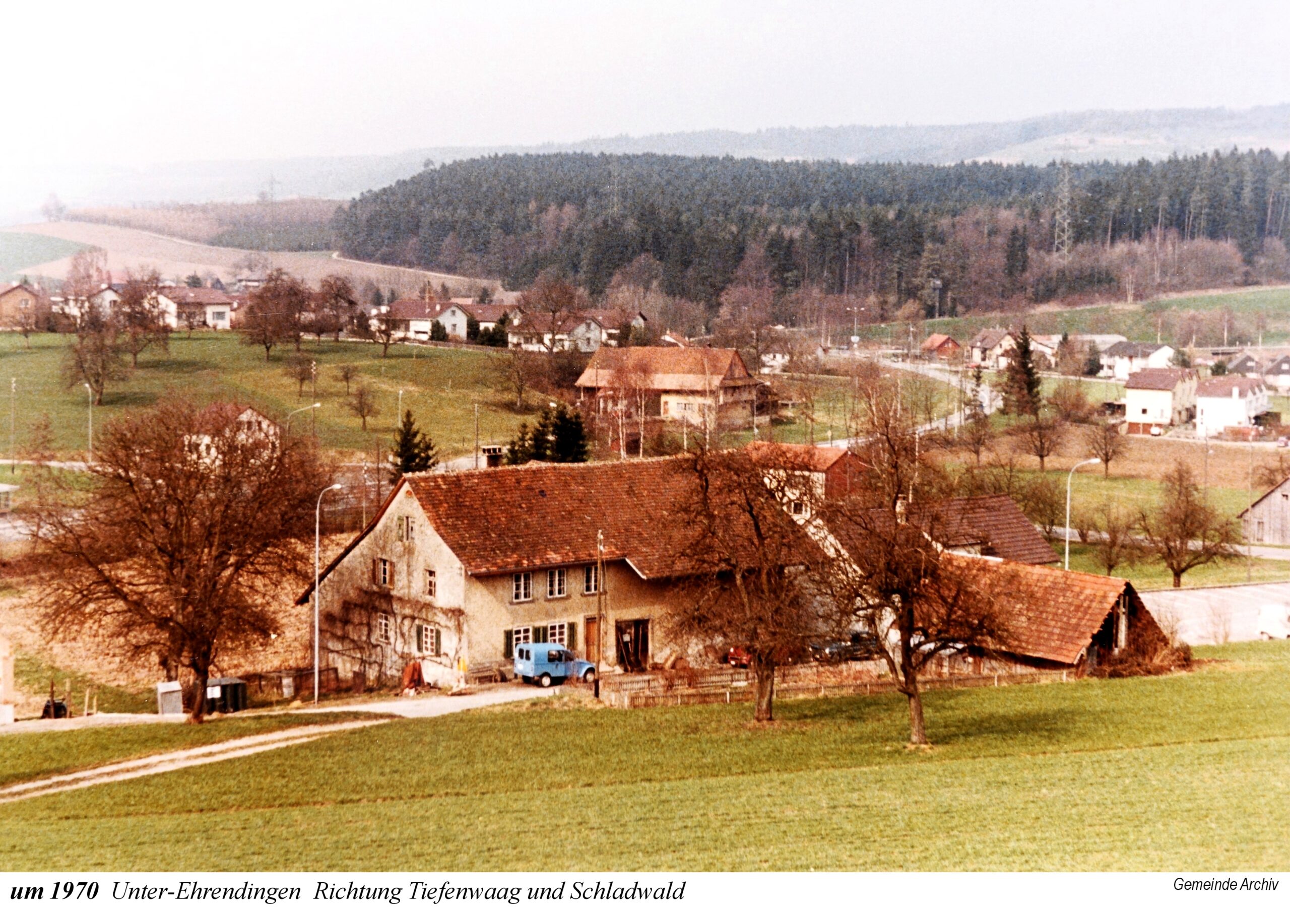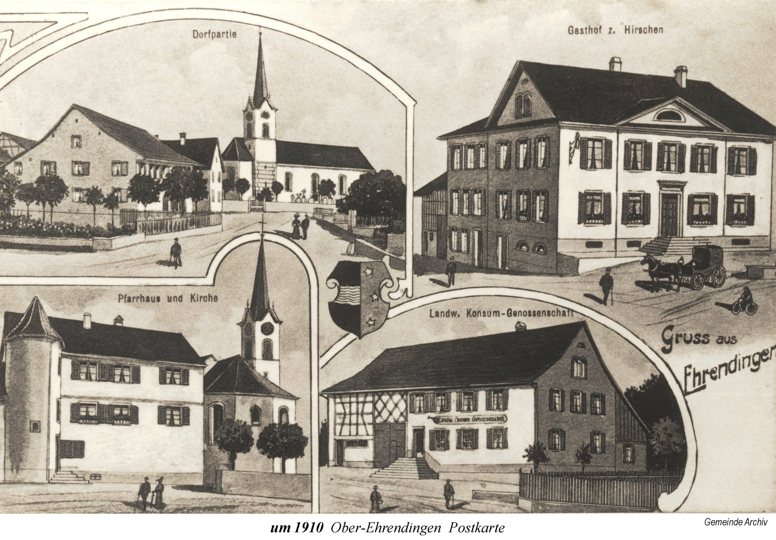 Die Ausstellung beginnt mit einem Ausschnitt aus der Zürcher-Cantons-Karte aus dem Jahr 1667. In Oberehrendingen sind neben der Kirche 12 Häuser zu sehen, in Unterehrendingen 15 Häuser sowie 3 Häuser in der Tiefenwaag. Es folgen Ansichten auf Postkarten, die Grüsse aus Ehrendingen in die weite Welt verschickt haben mögen. Eine Zeichnung vom Oberdorf aus dem Jahr 1836 zeigt die Pfarrkirche St. Blasius noch mit dem alten Käsbissenturm. Dann sehen wir Fotografien ab etwa dem Jahr 1910. Im Jahr 1935 bestaunen die Kinder einen grossen Zeppelin, der über Ehrendingen hinwegschwebt. Bemerkenswerterweise sind die Fotos aus dem Jahr 1945, die Pfarrer Huwyler teilweise vom Kirchturm herab geschossen hat, bereits in Farbe aufgenommen.