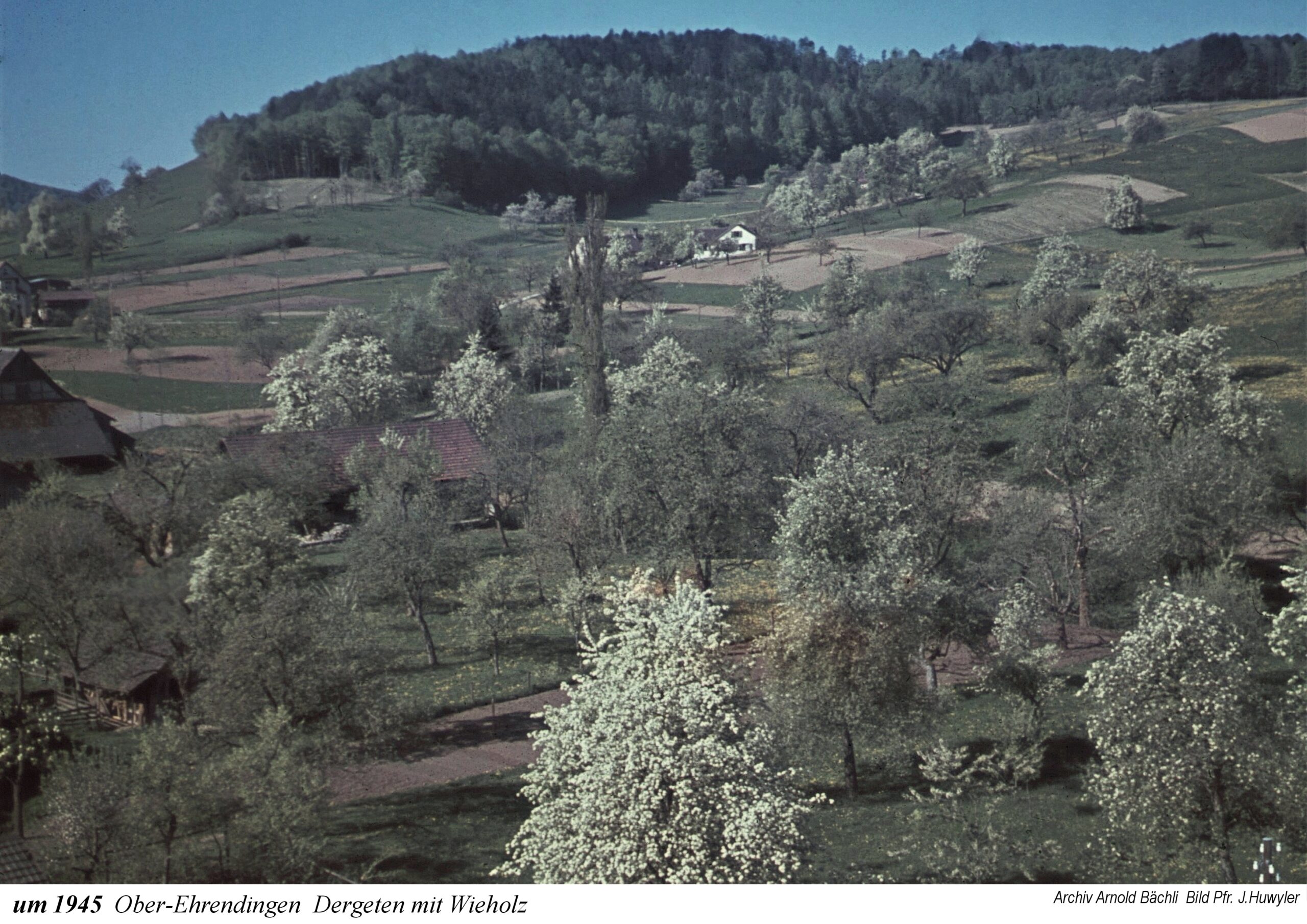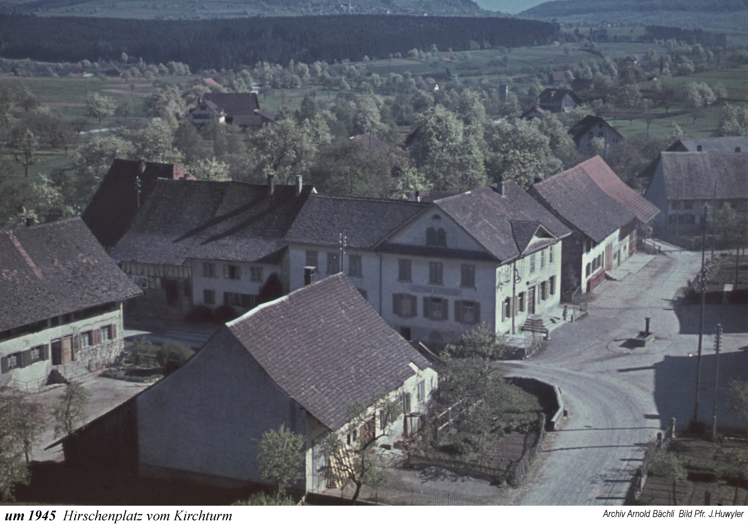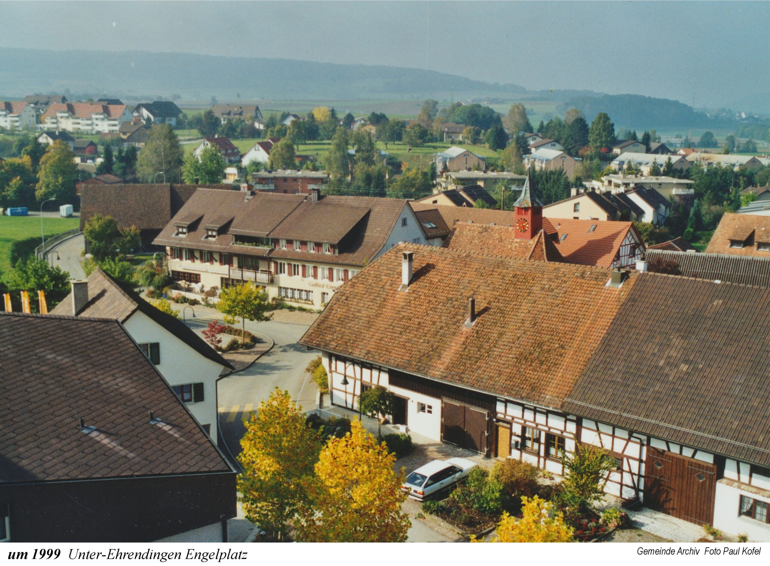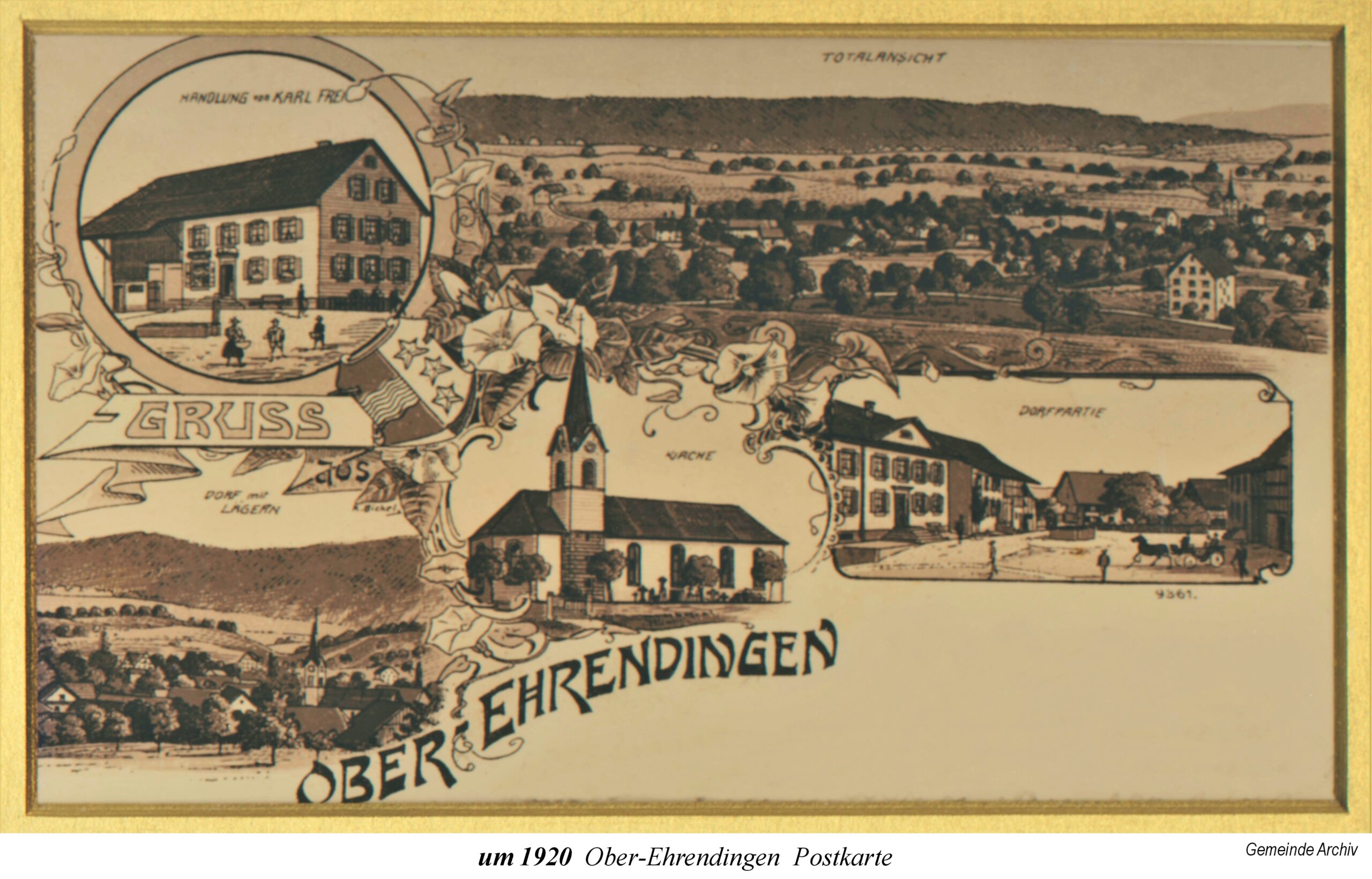Die Ausstellung beginnt mit einem Ausschnitt aus der Zürcher-Cantons-Karte aus dem Jahr 1667. In Oberehrendingen sind neben der Kirche 12 Häuser zu sehen, in Unterehrendingen 15 Häuser sowie 3 Häuser in der Tiefenwaag. Es folgen Ansichten auf Postkarten, die Grüsse aus Ehrendingen in die weite Welt verschickt haben mögen. Eine Zeichnung vom Oberdorf aus dem Jahr 1836 zeigt die Pfarrkirche St. Blasius noch mit dem alten Käsbissenturm. Dann sehen wir Fotografien ab etwa dem Jahr 1910. Im Jahr 1935 bestaunen die Kinder einen grossen Zeppelin, der über Ehrendingen hinwegschwebt. Bemerkenswerterweise sind die Fotos aus dem Jahr 1945, die Pfarrer Huwyler teilweise vom Kirchturm herab geschossen hat, bereits in Farbe aufgenommen.